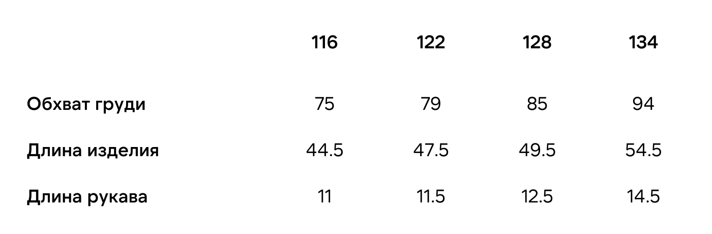 Все мерки указаны в сантиметрах. Измерения выполнены по изделию в разложенном виде на ровной поверхности. Возможна погрешность ±1–2 см. Подробнее о том, как выбрать подходящий размер.