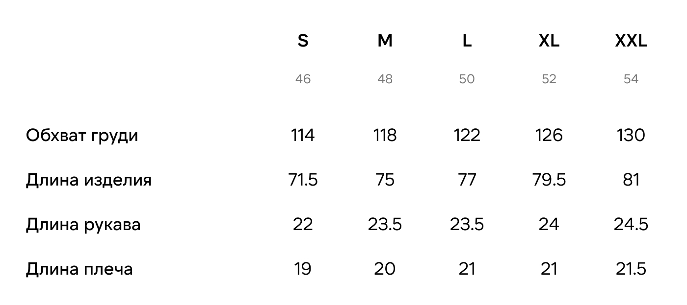 Все мерки указаны в сантиметрах. Измерения выполнены по изделию в разложенном виде на ровной поверхности. Возможна погрешность ±1–2 см. Подробнее о том, как выбрать подходящий размер.