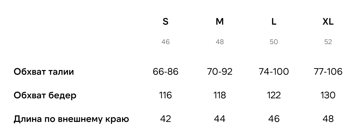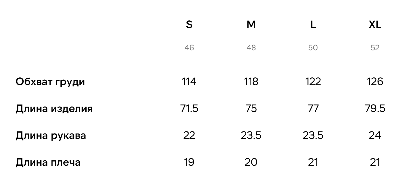 Все мерки указаны в сантиметрах. Измерения выполнены по изделию в разложенном виде на ровной поверхности. Возможна погрешность ±1–2 см. Подробнее о том, как выбрать подходящий размер.