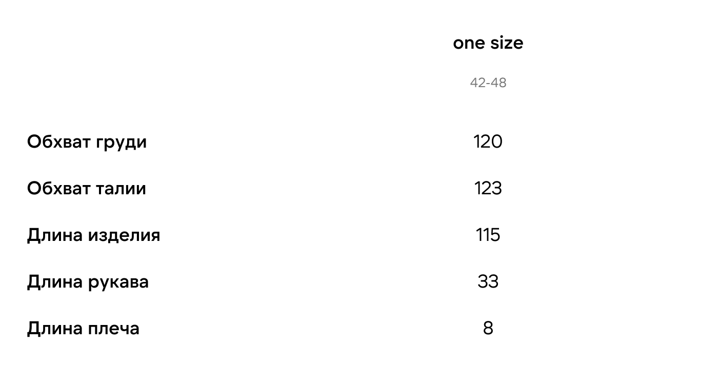Все мерки указаны в сантиметрах. Измерения выполнены по изделию в разложенном виде на ровной поверхности. Возможна погрешность ±1–2 см. Подробнее о том, как выбрать подходящий размер.