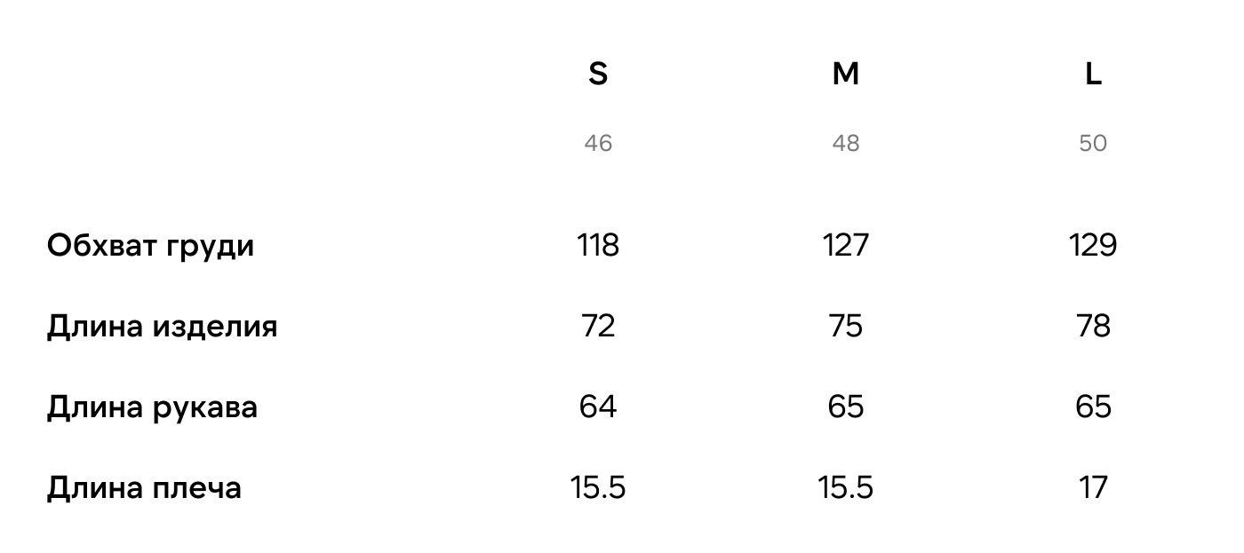 Все мерки указаны в сантиметрах. Измерения выполнены по изделию в разложенном виде на ровной поверхности. Возможна погрешность ±1–2 см. Подробнее о том, как выбрать подходящий размер.