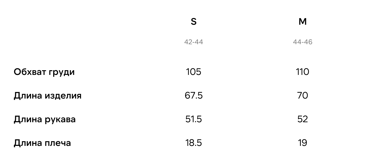 Все мерки указаны в сантиметрах. Измерения выполнены по изделию в разложенном виде на ровной поверхности. Возможна погрешность ±1–2 см. Подробнее о том, как выбрать подходящий размер.