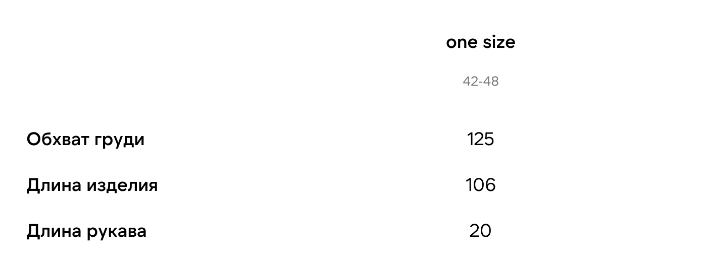 Все мерки указаны в сантиметрах. Измерения выполнены по изделию в разложенном виде на ровной поверхности. Возможна погрешность ±1–2 см. Подробнее о том, как выбрать подходящий размер.