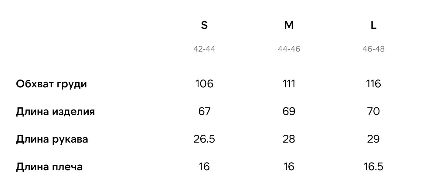 Все мерки указаны в сантиметрах. Измерения выполнены по изделию в разложенном виде на ровной поверхности. Возможна погрешность ±1–2 см. Подробнее о том, как выбрать подходящий размер.