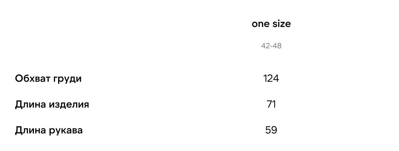 Все мерки указаны в сантиметрах. Измерения выполнены по изделию в разложенном виде на ровной поверхности. Возможна погрешность ±1–2 см. Подробнее о том, как выбрать подходящий размер.