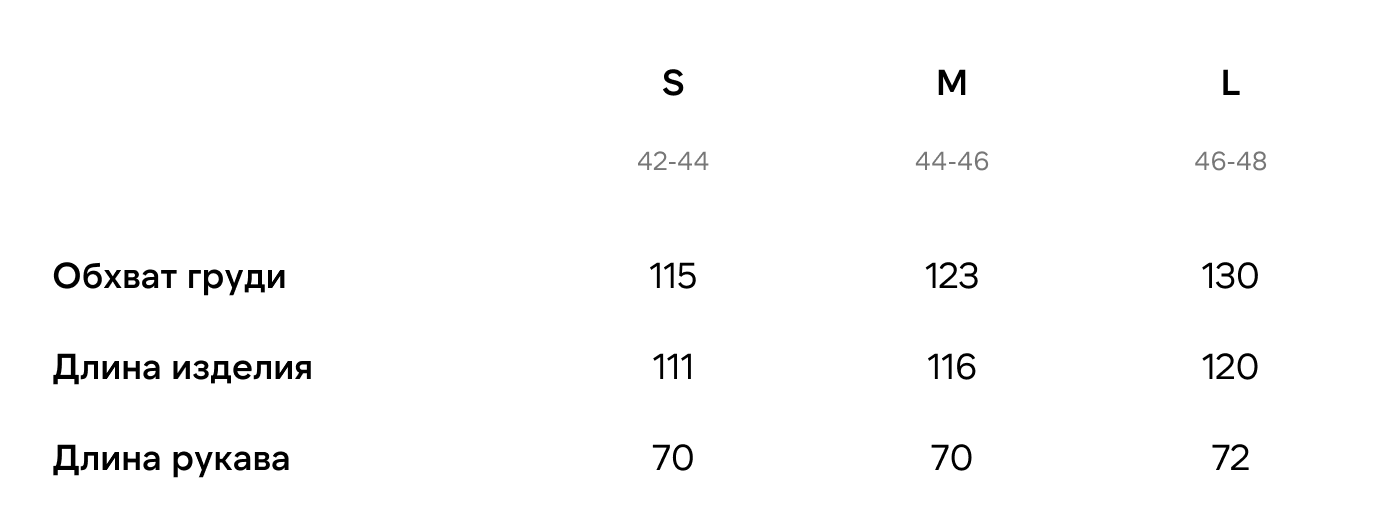 Все мерки указаны в сантиметрах. Измерения выполнены по изделию в разложенном виде на ровной поверхности. Возможна погрешность ±1–2 см. Подробнее о том, как выбрать подходящий размер.